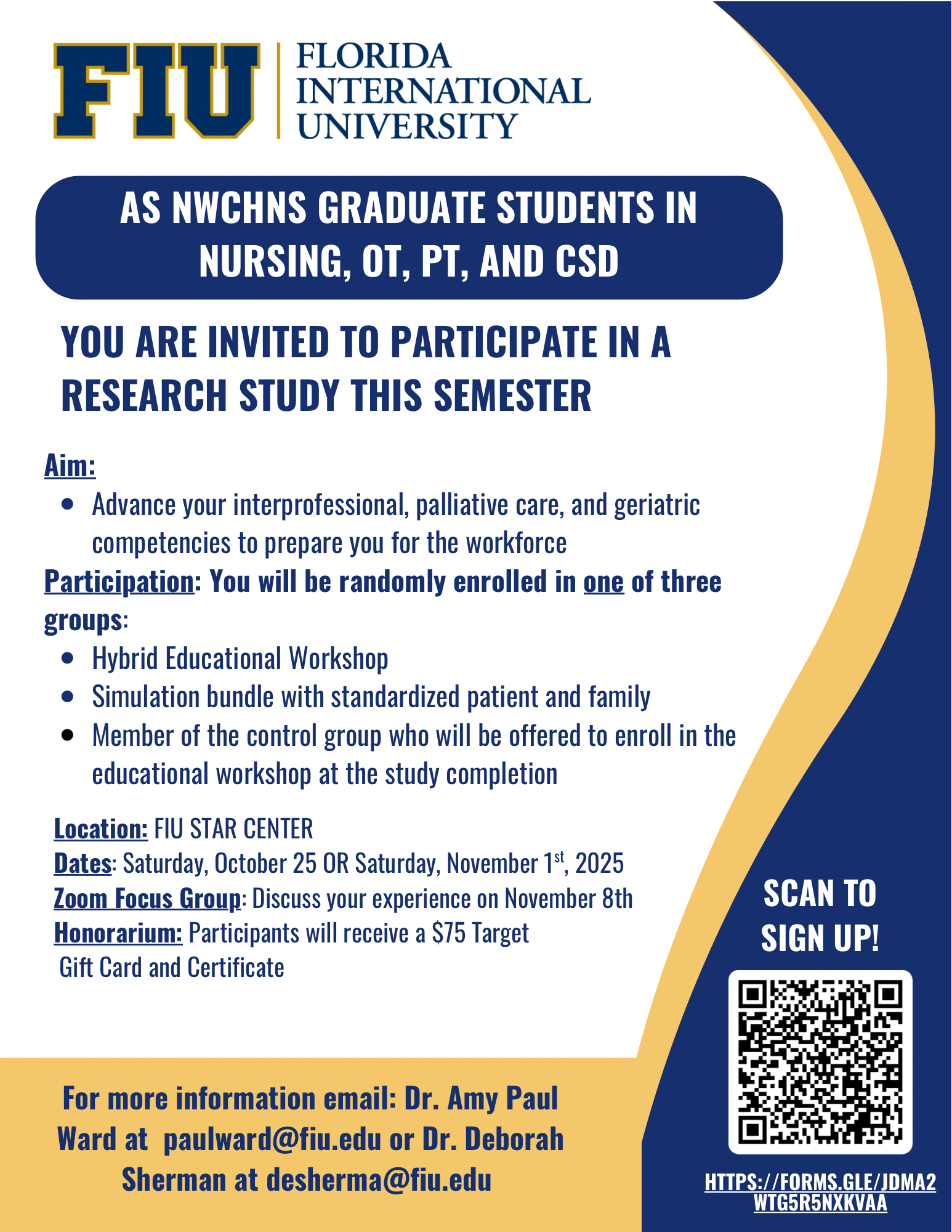 Health Resources & Services Administration’s Bureau of Health Workforce has awarded the Department of Communication Sciences and Disorders (CSD) the Scholarships for Disadvantaged Students (SDS) grant. This SDS grant aims to increase the enrollment and retention of full-time students who will be working in primary care or medically underserved communities. First and second-year CSD graduate students from disadvantaged backgrounds who have a financial need are invited to apply. For more information, please contact Dr. Mariateresa (Teri) H. Muñoz, Principal Investigator, at munozt@fiu.edu or Dr. Monica S. Hough, CSD Department Chair and Co-Investigator, at mshough@fiu.edu.